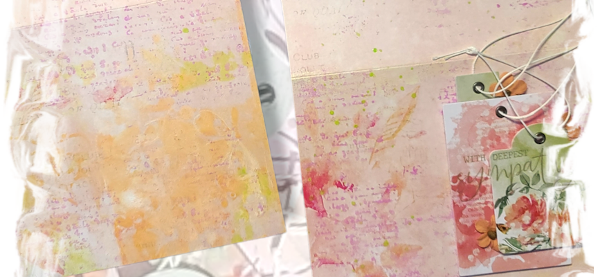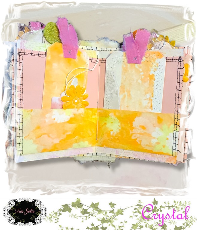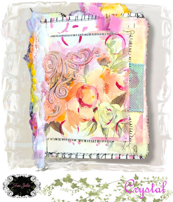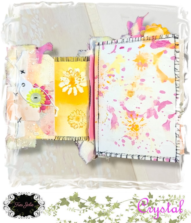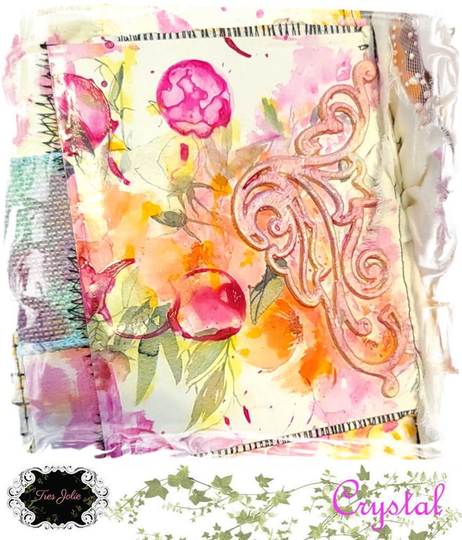 From the front cover to the back cover there is a variety of patterns and colors. The fabric flowers worked fabulously during the gel plate printing process and made their way onto the finished product.