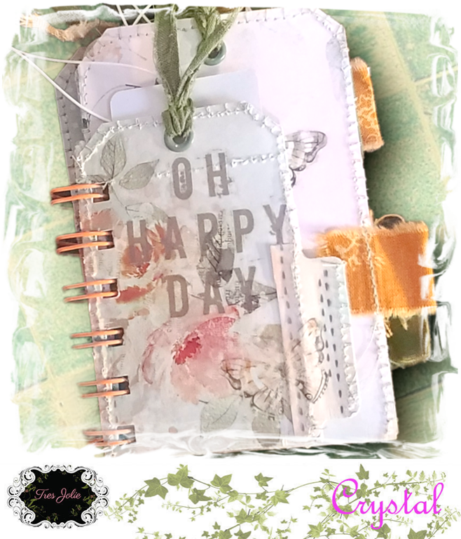 On the tags, I used white thread, and instead of punching holes and adding the tag pulls, I crossed two staples from my Tim Holtz Tiny Attacher.