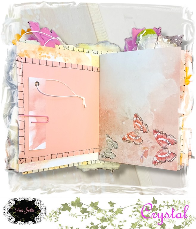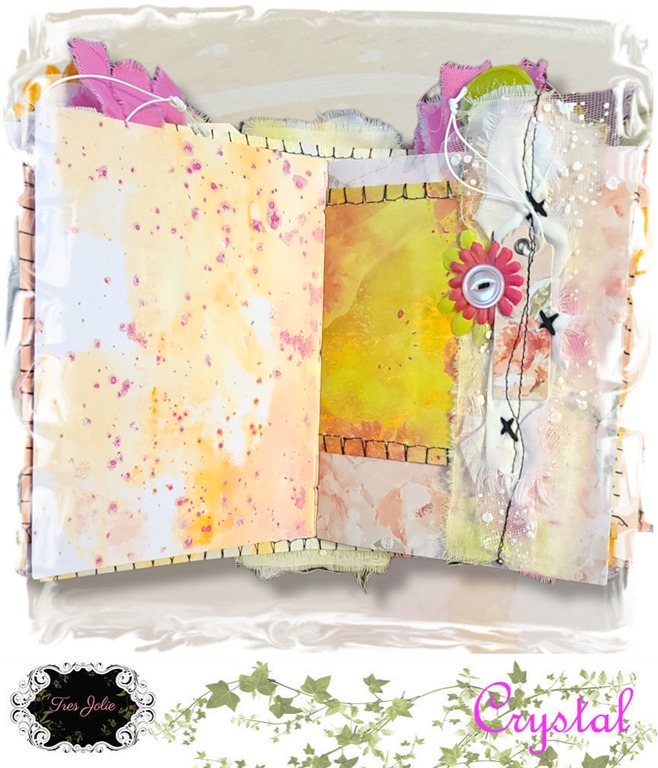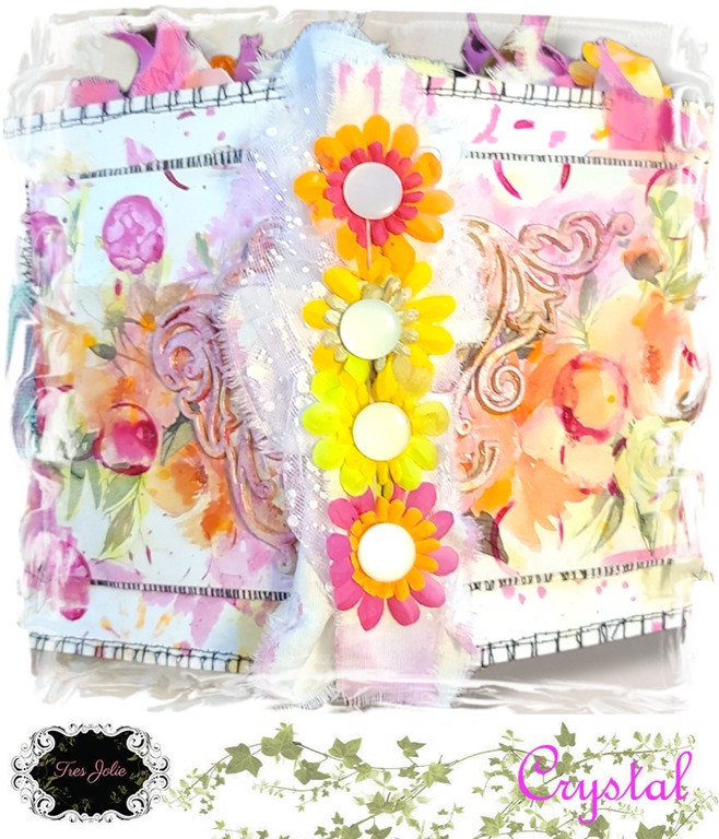 The spine of the journal has some scrap fabric, tulle, fabric flowers, and buttons from my stash on it. Like the other flowers throughout the journal, these flowers also have some Glossy Spray added to them.