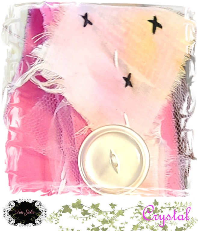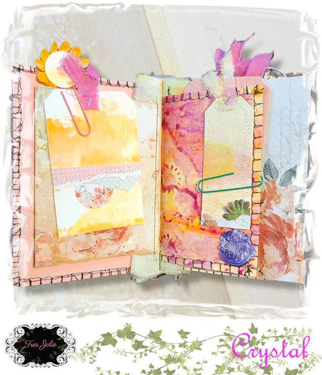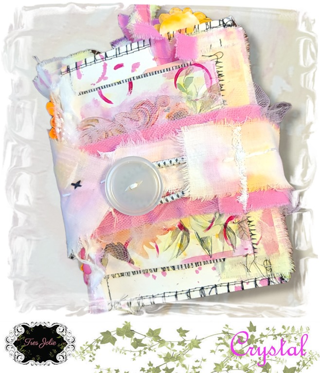 *Tonic Nuvo Embellishment Mousse: “Coral Calypso” & “Mother of Pearl;” Tim Holtz tiny Attacher; Finnabair 3D Matte Gel; We R Memory Keepers Corner Chomper; Fiskars 1” Circle Punch; cardstock; Ranger Heat-It Tool; wax & wax seal stamps; bookbinding thread & needle; awl; foam mat; hair tie; large paperclips; fabric flowers; LineCo PVA Glue; Aleene’s Tacky Glue; UHU Stic; random scrap fabric; tulle; black & white threads; buttons; hot glue