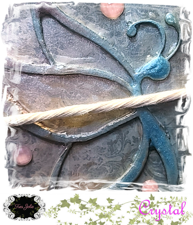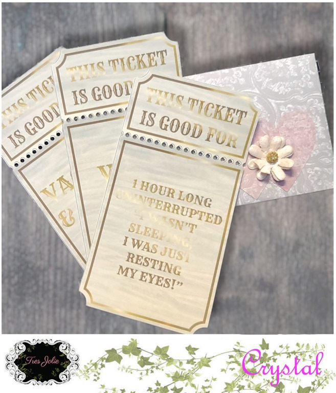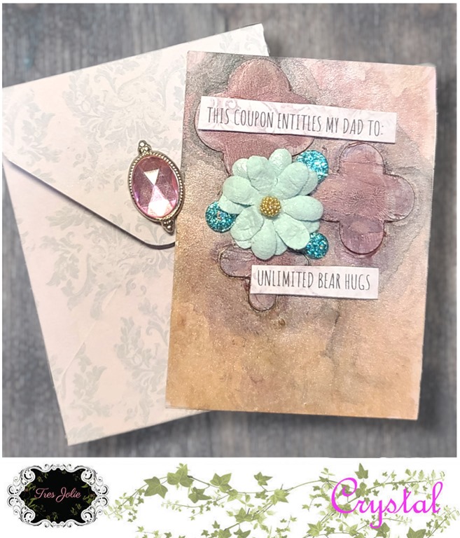 My final example is another “Unlimited” coupon in the form of an ATC. Making an ATC allows some personalized artwork to also be part of the gift! For my ATC I cut a piece of the patterned paper to size, added some of the lattice-ish bits I had left from my Mother’s Day Cards, used some of the Finnabair micas from this month’s Mixed Media Kit, popped on some Say-It-In-Crystals and a flower, then printed out my phrase and glued it on.