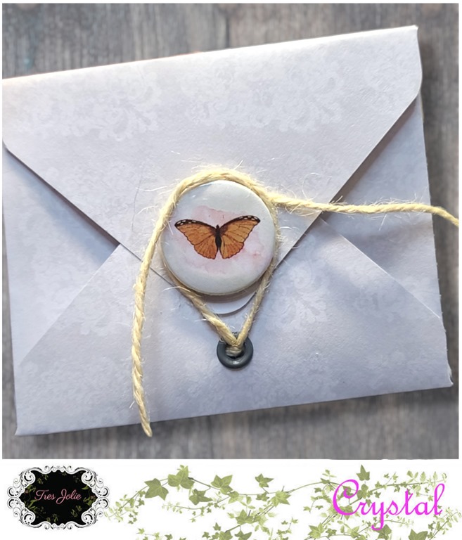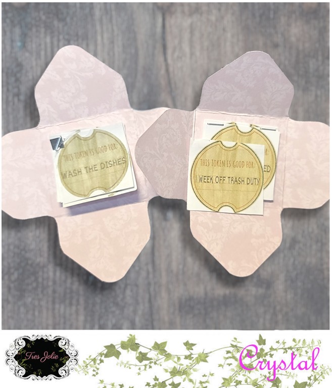 I have a couple of different envelope examples for these coupons. One I made to have a tie closure, so I never sealed any of the flaps. I added an eyelet in the bottom flap and attached one of the flair from the kit to the top flap, then ran a piece of twine through the eyelet to tie the envelope closed. The second envelope I made I left open. I folded the top flap back and glued it in place so the coupons would be able to stick out the top.