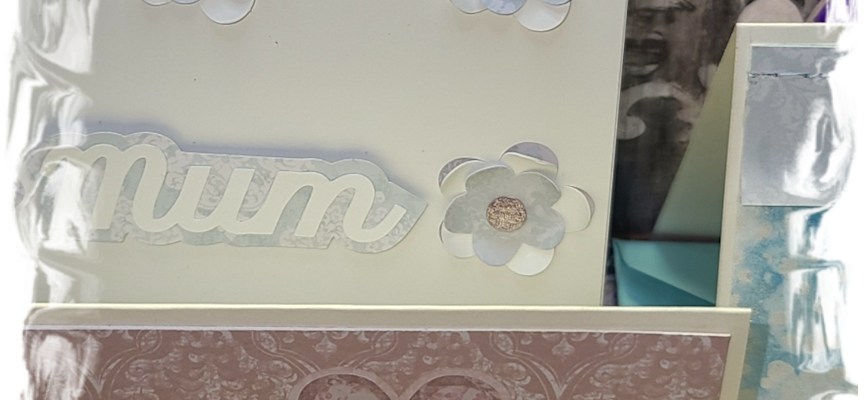 The envelope for these coupons is a hand-folded sheet of the 6×6 patterned paper. I just eyeballed the center and eyeballed where I wanted the folds. Then for a little decoration on the front, I added a couple of the leftover hearts from my Mother’s Day Cards and one of the Prima flowers.
