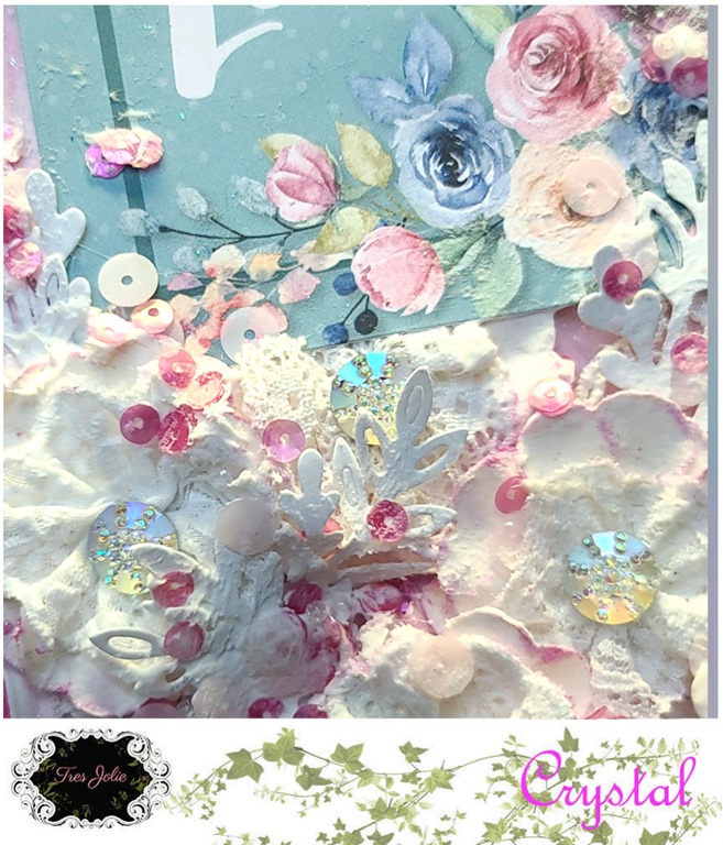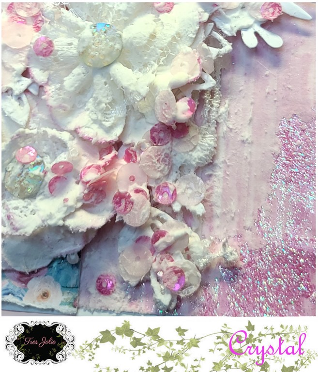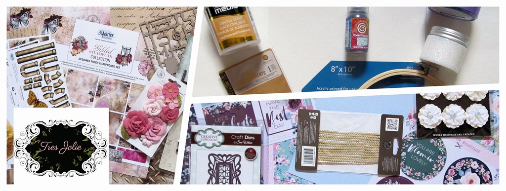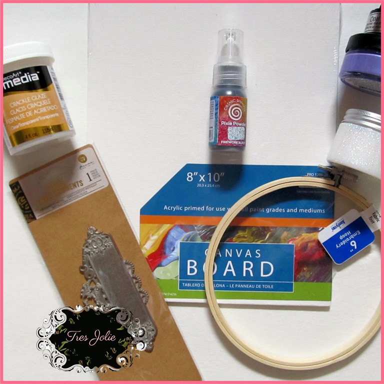 In addition to this month’s Cards, Tags, & More Kit and the Crackle Glaze & Sparkle Texture Paste from this month’s Mixed Media Kit (from previous Tres Jolie Kits), I used: