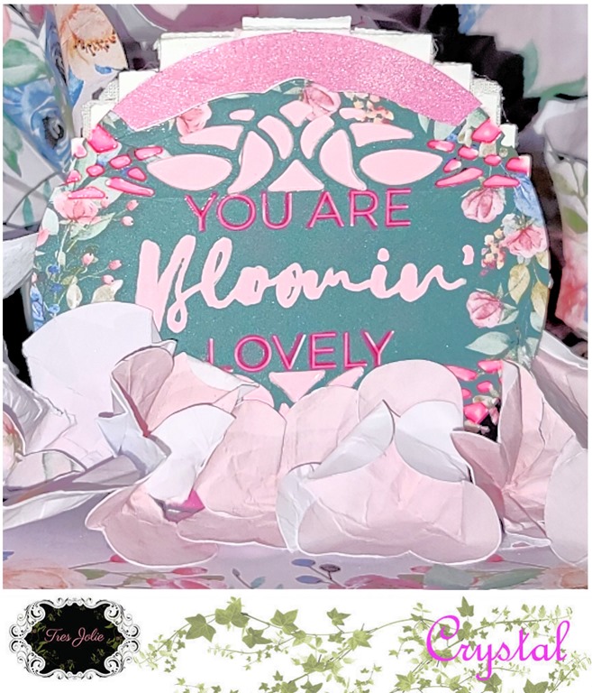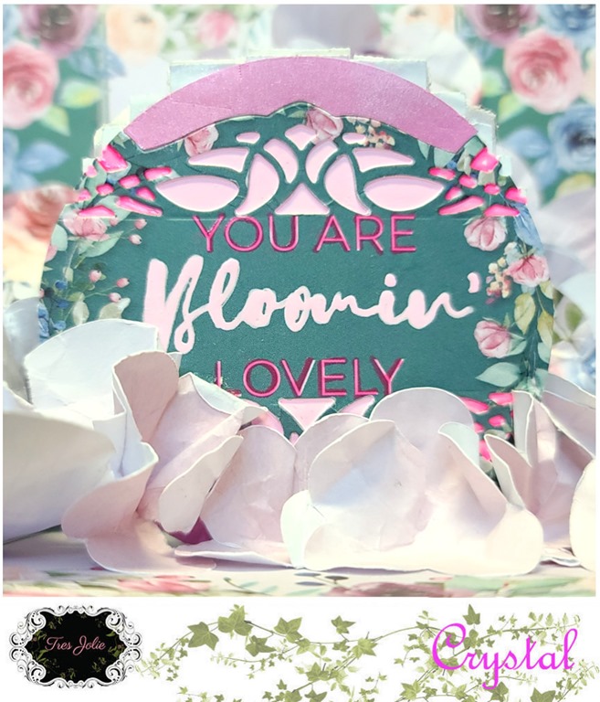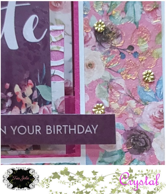 *Prima “Tubaroses” Stencil, *Jacquard “Brilliant Gold” PearlEx, *Finnabair Pixie Dust Fixative, *Buttons Galore & More “28 Lilac Lane”, Ranger Opaque Matte Texture Paste, Momenta Dies 2157535, heavy cardstock – dark pink, white printer weight cardstock, Spellbinders Tool ‘n One, Silhouette Cameo 3, Nicapa Mat, Silhouette Premium Blade, Sizzix Big Shot Plus, spray bottle, 1” double-sided tape, Art Glitter Glue, Gorilla Mini Hot Glue Stick, hot glue gun, lace trim