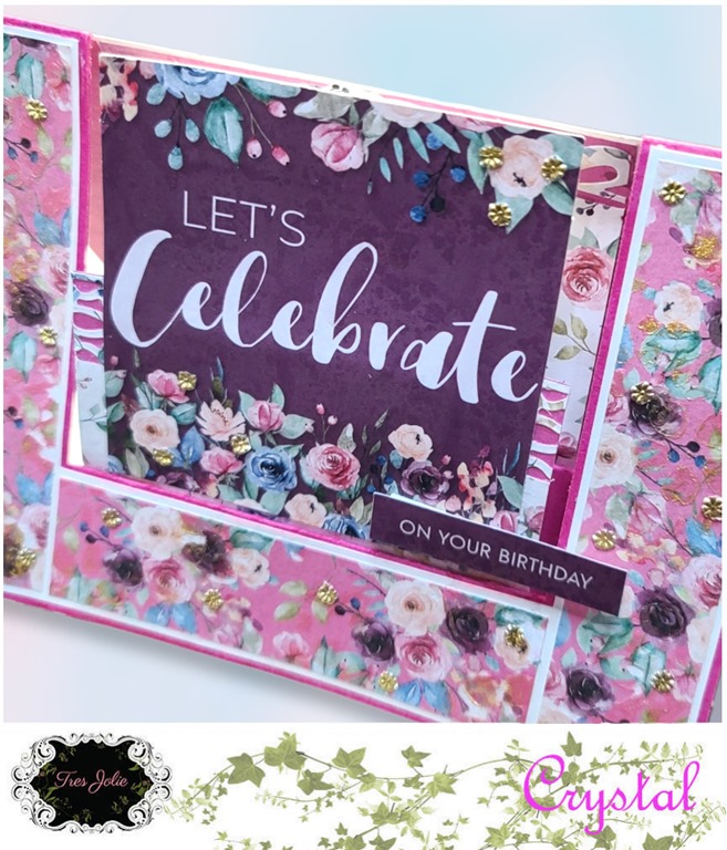 This first card is a step-card that I created. I used a dark pink cardstock for the base topped with some white, printer-weight cardstock. I did put a solid back on my step-card, which also required a couple of extra pieces tucked in to make sure my “Let’s Celebrate” square popped forward when the card was standing up.