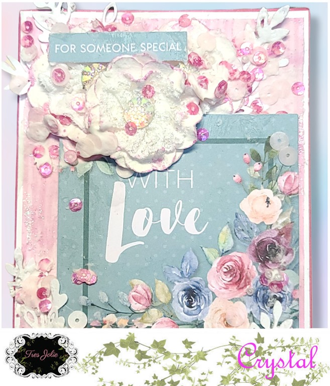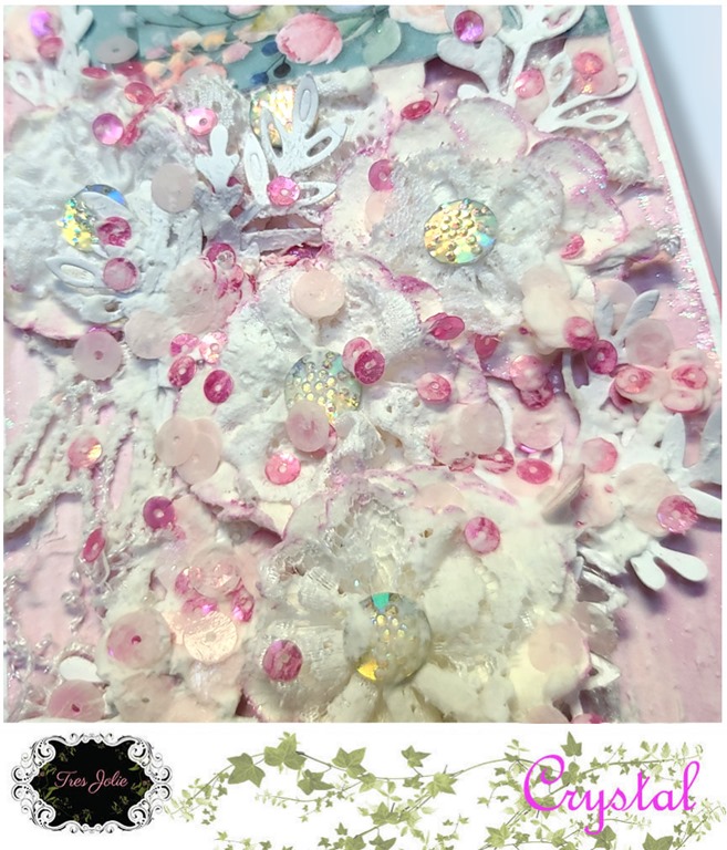 Once the texture paste had dried, it was just a matter of gluing all of my flowers down, along with some leaf die cuts (using a die from my stash), a few bits of lace trim, and the sentiment square. I used my hot glue gun for all of this, so I was able to move right to adding the sequins to the front after adding the top “For Someone Special” sentiment at the top and a little square of the same teal paper at the bottom just to have that blue “continue” all the way down. All I did to add the sequins was use some more texture paste, watered down a little to make it more spreadable, dipped a brush into the paste, use it to pick up some sequins, and “brush” them on.