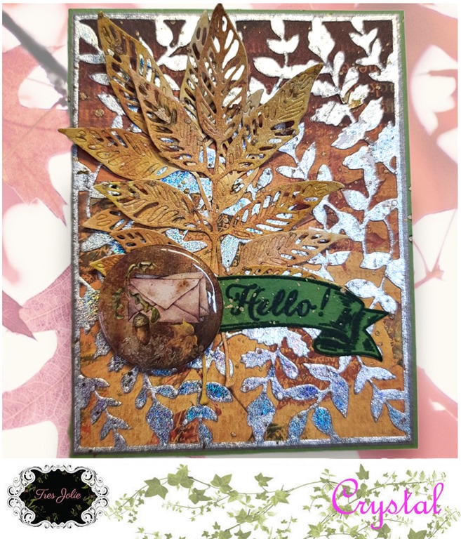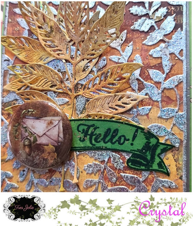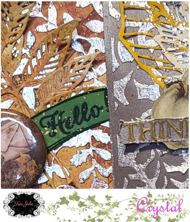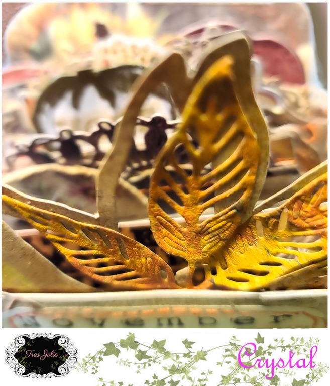 Distress Ink “Fossilized Amber” , Distress Ink “Rustic Wilderness” , Distress Oxide “Rustic Wilderness” , Distress Oxide “Fossilized Amber” , Distress Mica Stain “Crooked Broomstick” , Distress Mica Stain “Flickering Candle” , Distress Crayon “Crooked Broomstick” , Distress Crayon “Flickering Candle” , Tim Holtz “Skeleton Leaves” Thinlits , *BoBunny “Sentiments With Love” Stamp Set , BoBunny “Lovely Leaf” Dies , Momenta “Leaves & Vines” Mat Die , Hampton Art Clear Embossing Powder , Distress Embossing Glaze “Rustic Wilderness” , Spellbinders Tool ‘n One , Tim Holtz Stamp Platform , Sizzix Big Shot Plus , cardstock from my scrap pile , unbranded small oak and maple leaf dies , Fabri-Tac , Art Glitter Glue , foam squares , *Prima Water Brush , *spray bottle