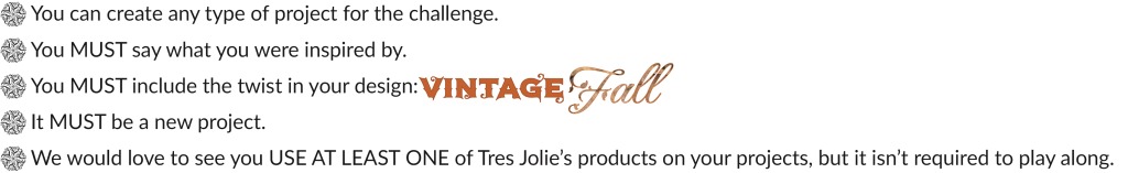 Place your entries in the October 2022 challenge folder on the Tres Jolie Kit Club Café Facebook page. This challenge ends on October 31st, 2022 at 11:59 pm CST. All entries must be in this folder to be eligible for the prize (to have everyone eligible to win, we are limiting the same winner to once every 3 months).