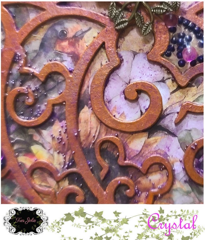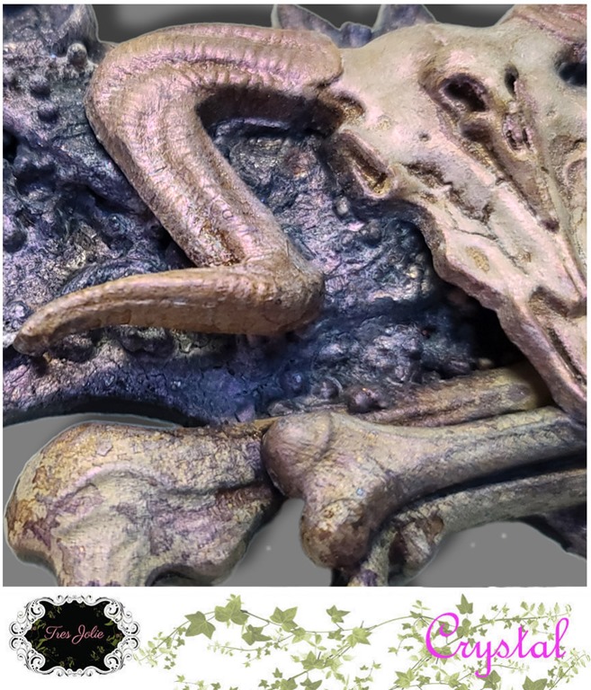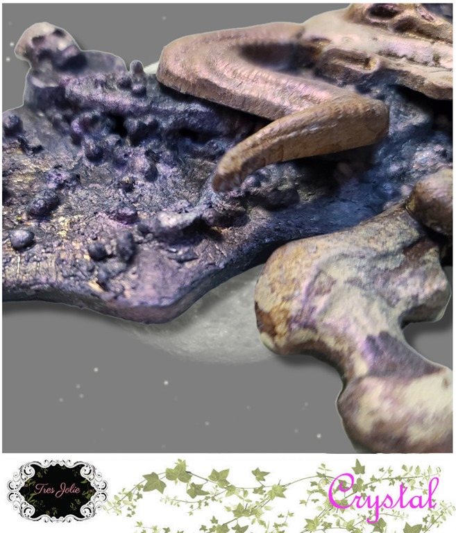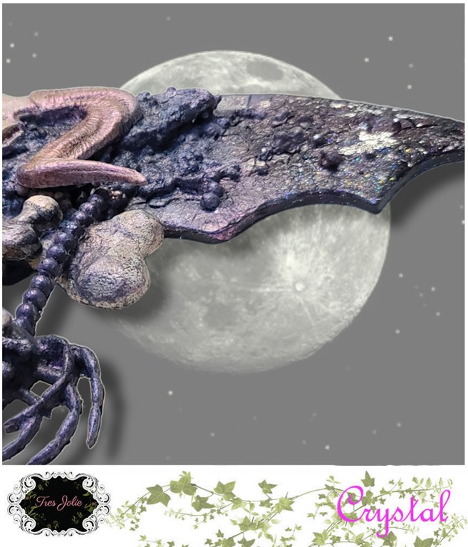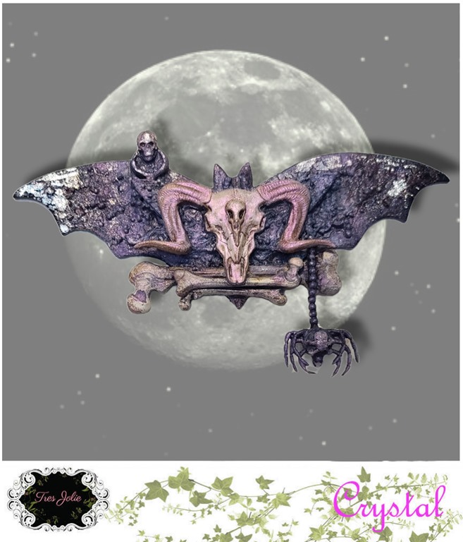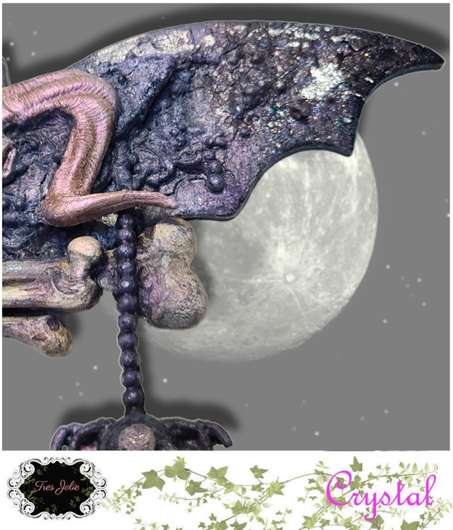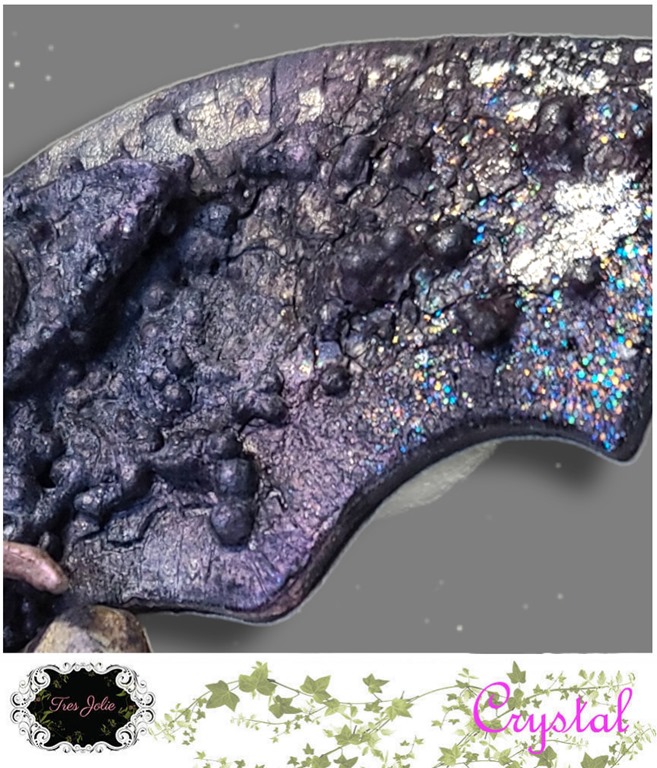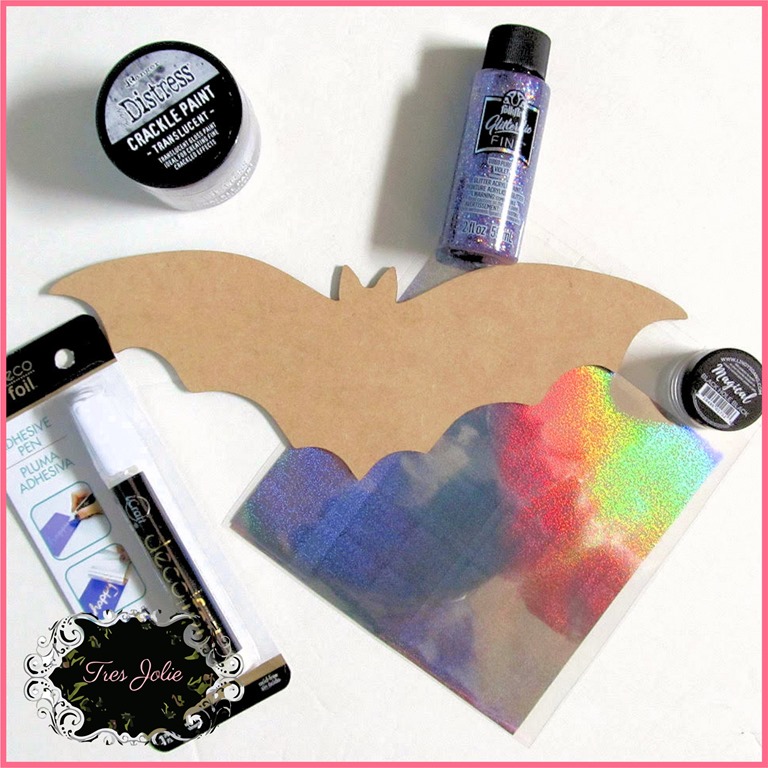 I love making Halloween-themed decorations! I don’t know why exactly, I think it must speak to the GenX “goth” side of me! Anyhow, the Mixed Media Kit this month from Tres Jolie Kit Club has just what you need to get going on your next Halloween (or goth!) décor piece – a bat base, foil transfer sheets, purple glitter paint, “Black Hole Black” Magical Powder, and some Distress Crackle! You could easily use just the mediums from the kit to decorate the bat base, or you can start with the bat and see what you can build up on it.