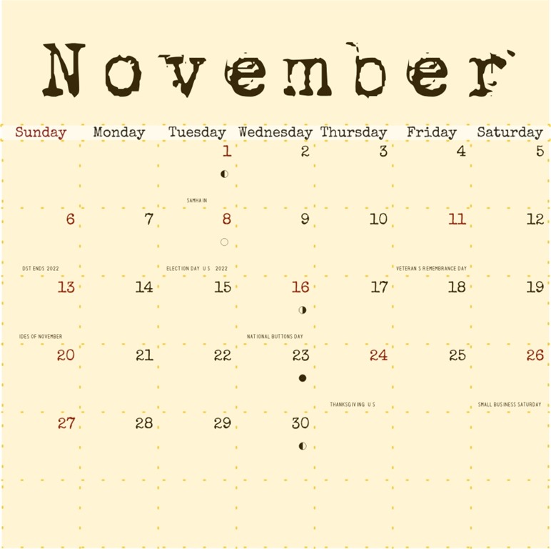 As I noted in the video, this was the day I discovered my printer had decided to retire, so my calendar is only a black-and-white printout, instead of the original design that I shared near the beginning of this post. The “Native American History Month” Card is actually one of the envelope cards, and inside it, I added a couple of little fact sheets printed from the National Congress of American Indians and the U.S. government’s Native American Heritage Month website. And of course, I have a card to remind me that Daylight Savings Time ends on the sixth, and we “Fall Back” an hour.