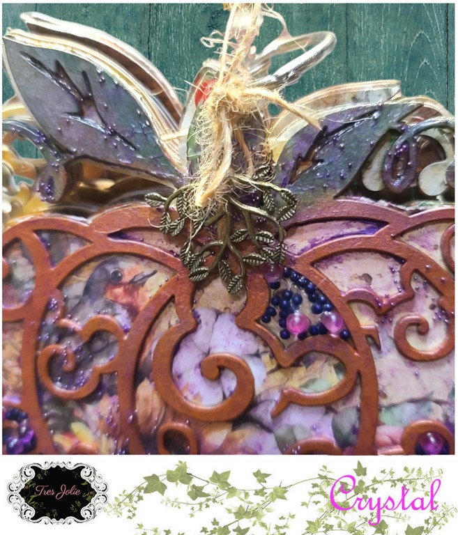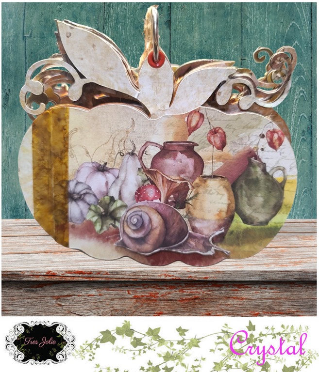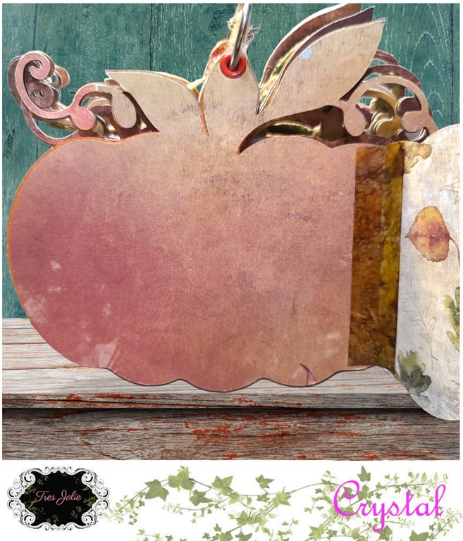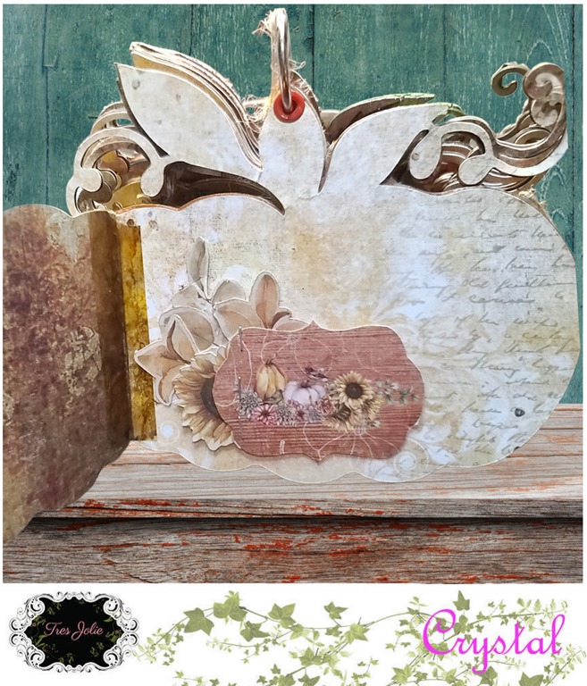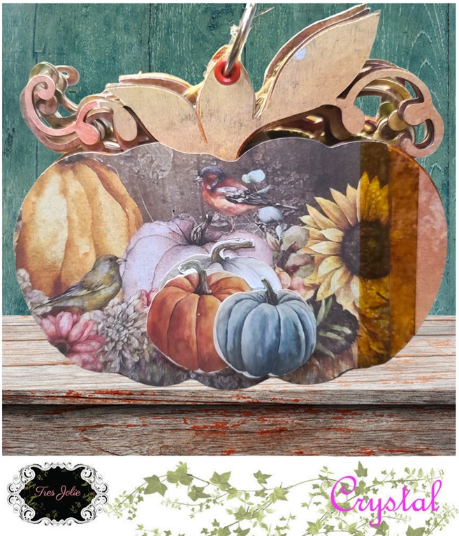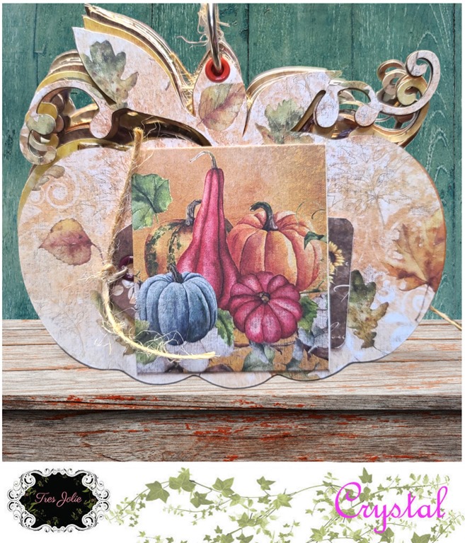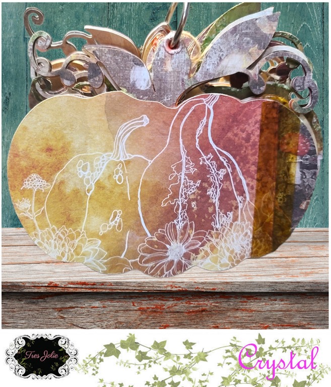 I must admit, I love pumpkins! As decoration. I won’t eat or drink them, but I love pumpkins and gourds as décor; so I was super excited to see this adorable Tres Jolie Chipboard Pumpkin Mini Album in the October Cards, Tags, & More Kit!