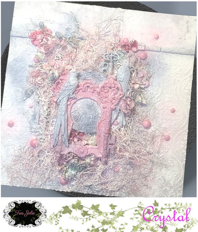 *DecoArt White Crackle Paint , *TCW “Mini Art Deco Leaves” Stencil , *Ingvild Bolme Shabby Chic Treasures “Birds” , *Finnabair Liquid Fluid Color Medium , *Finnabair Texture Powder , *Finnabair “Graphite” Texture Paste , Finnabair “Pixie” Effect Paste , *Finnabair “Old White” Matte Wax , Finnabair “Shabby Pink” Matte Wax , Finnabair “Indian Pink” Metallique Wax , Finnabair “Sweet Rose” Metallique Wax , Finnabair “Ash Grey” Antiquing Wax , Finnabair Clear Antiquing Wax , Finnabair “Victorian Tiles” Stencil , Finnabair “Baroque Frames” Mould , Finnabair “Locks and Keys” Mould , Finnabair “Clockfaces” Mould , Finnabair “Cool Grey” Rust Effect Paste , Finnabair Clear Gesso , Finnabair 3D Matte Gel , Winsor & Newton “Payne’s Gray” Watercolor , Ranger Texture Paste “Opaque Matte” , *Distress Texture Paste “Crackle” , Distress Grit Paste “Translucent” , Distress Grit Paste “Crypt” , Distress Texture Paste “Grave” , Distress Oxide Spray “Tattered Rose” , Distress Oxide Spray “Pumice Stone” , Distress Spray Stain “Weathered Wood” , Distress Oxide Spray “Weathered Wood” , Distress Spray Stain “Hickory Smoke” , Distress Oxide Spray “Hickory Smoke” , Distress Mica Stain “Cocktail Party” , Distress Crayon “Picket Fence” , Distress Crayon “Tattered Rose” , Distress Crayon “Kitsch Flamingo” , Distress Crayon “Cocktail Party” , Distress Paint “Tattered Rose” , Distress Paint “Kitsch Flamingo” , Distress Paint “Hickory Smoke” , Distress Embossing Glaze “Kitsch Flamingo” , Tim Holtz “Skeleton Leaves” Thinlits , Ranger Water Brush , *Prima Water Brush , white ribbon roses , white leaves , pink sisal , Mont Marte 12” x 12” Canvas Panel , Liquitex Matte Medium , Daler Rowney White Gesso , Gorilla Clear Grip , Amazing Casting Resin ,  *spray bottle