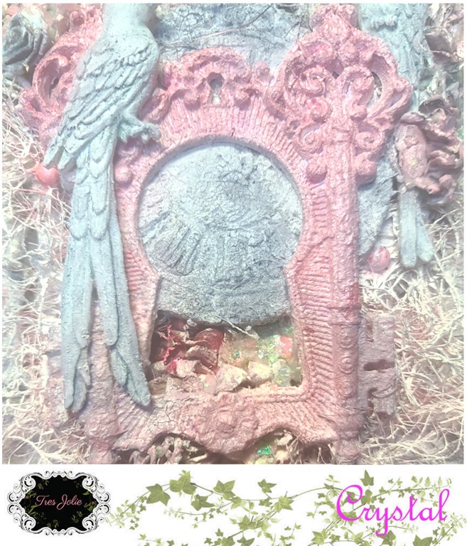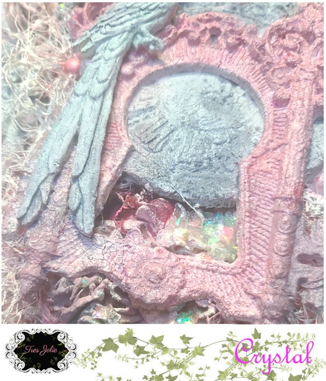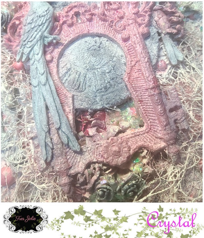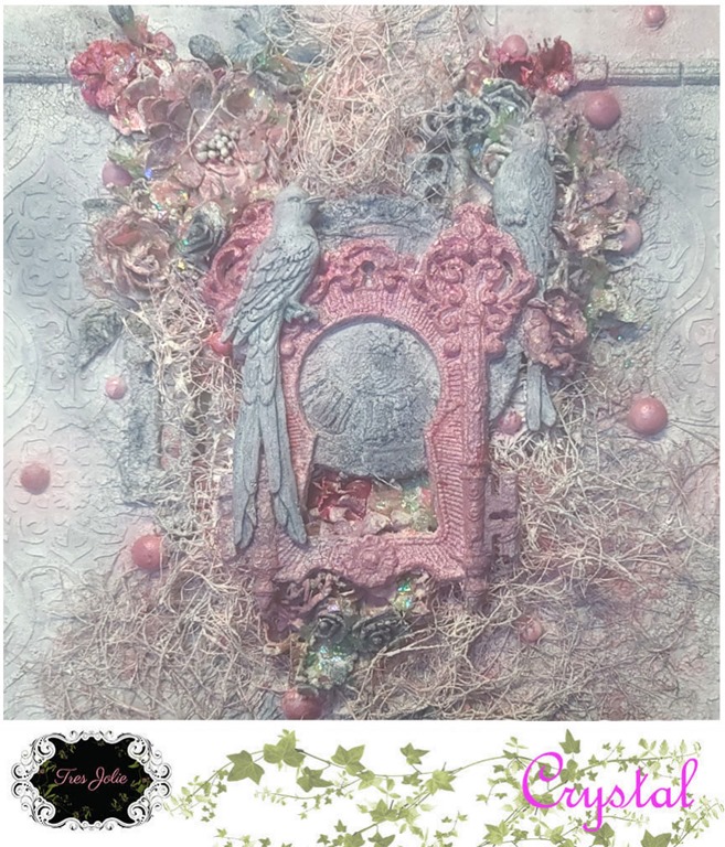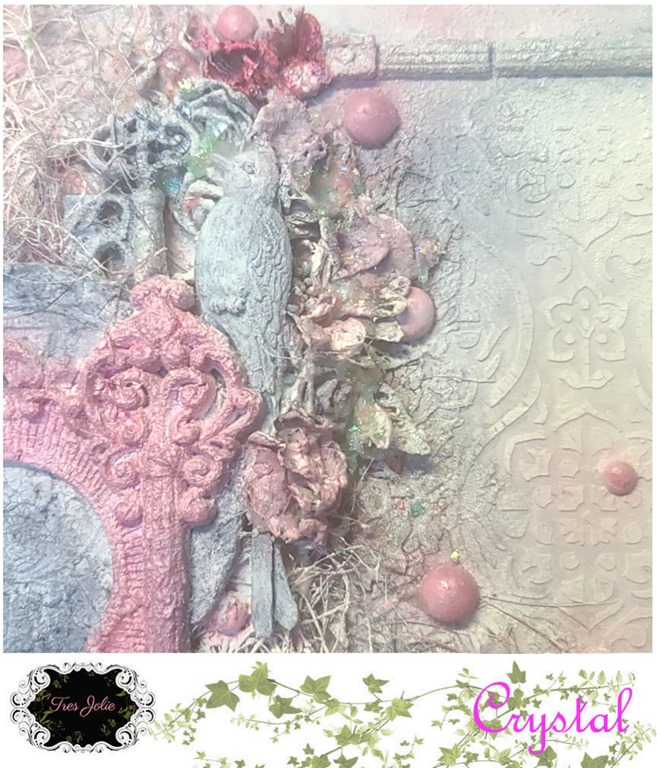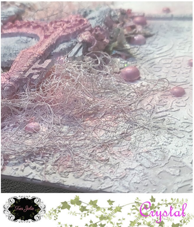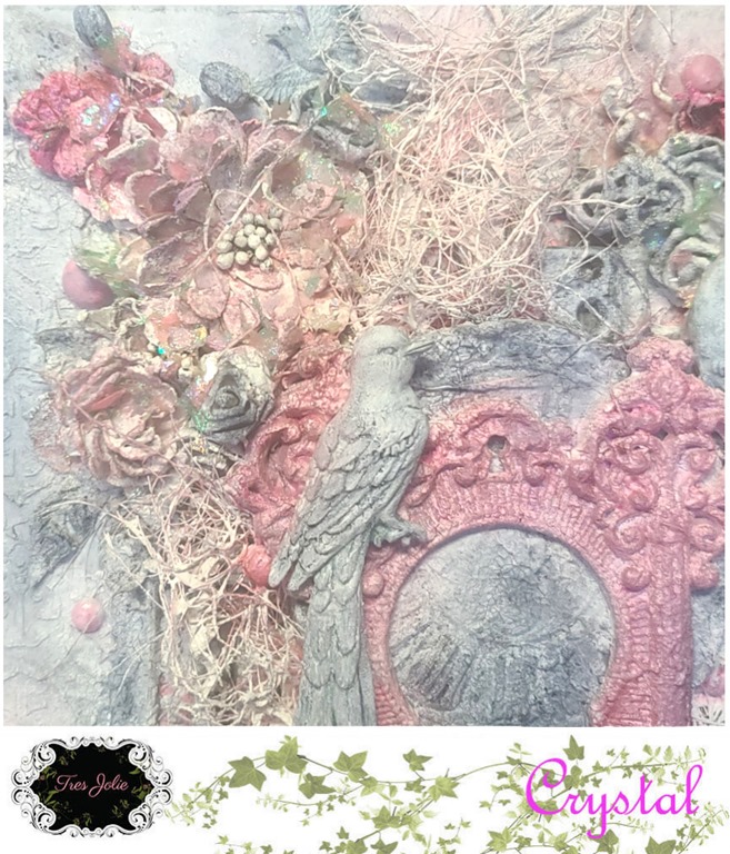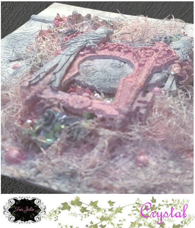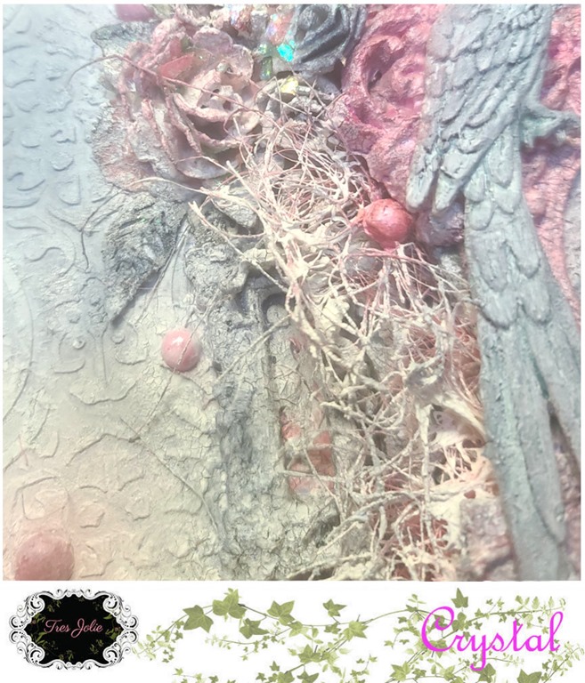After all of my mould pieces were in place, I added some areas of DecoArt White Crackle Paint, tucked in some pink sisal, added more crackle paint, got my Ingvild Bolme birds in place, and added a little crackle paint to them.