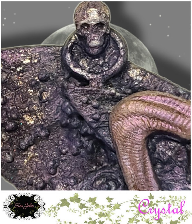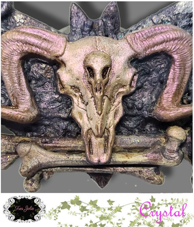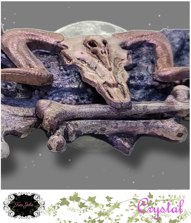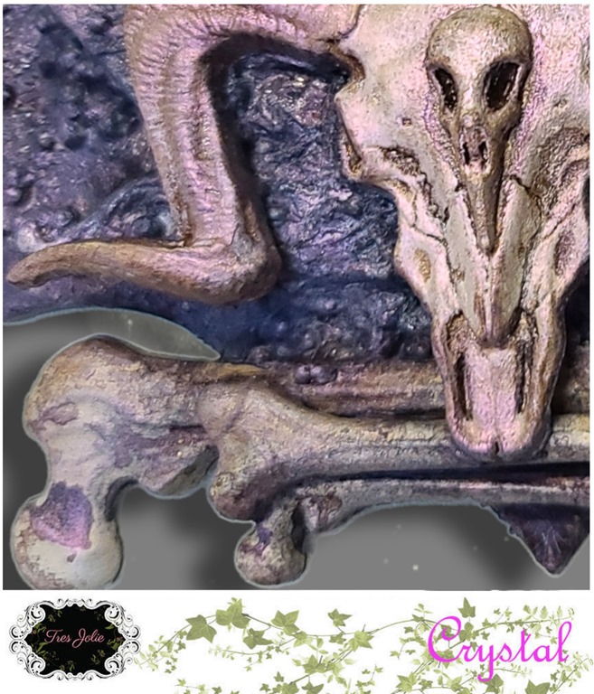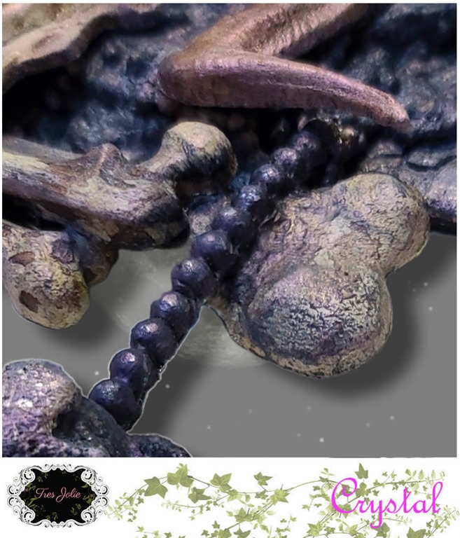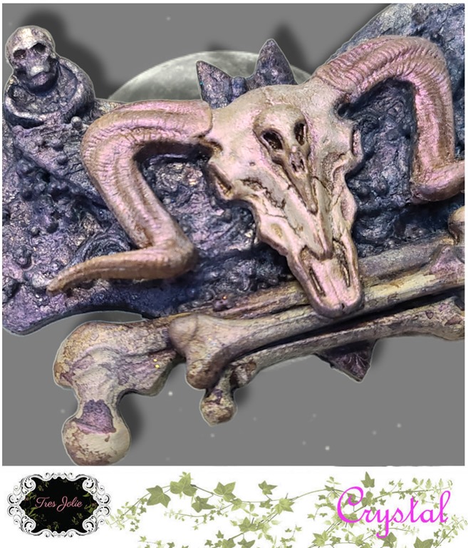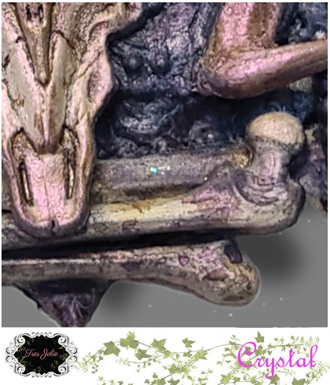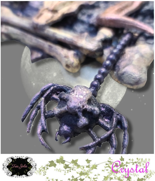While I let the Lindy’s dry, I started prepping all of my resin pieces. All of the bones started with a layer of white gesso, followed by a layer of Finnabair “Linen” Impasto Heavy Body Acrylic Paint. All of the other mould pieces started with a layer of black gesso and then were coated with a mix of “Ink Black” Liquid Acrylic Paint, FolkArt Purple Glitter Paint, and some Cosmic Shimmer “Fireworks Burst” Pixie Powder. I just mixed everything together to darken the pieces while giving them some shine at the same time. I also took this opportunity to give my bat a spray of some Finnabair Pixie Dust to hold the Black Hole Black Magical Powder in place.