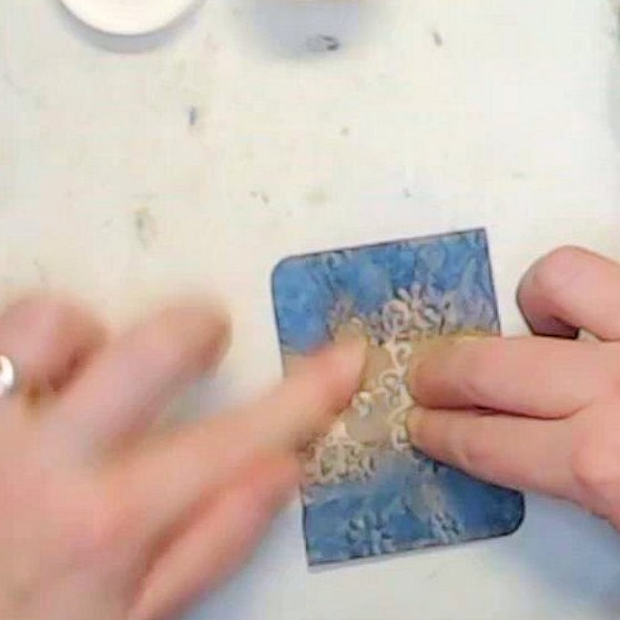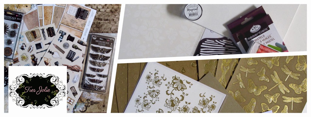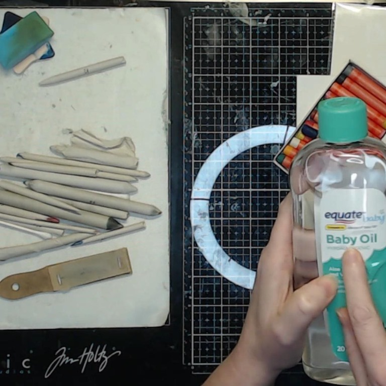 Ranger Big Emboss It Clear, Krylon Workable Fixatif, cosmetic sponges, blending stubs, Q-tips®, baby oil