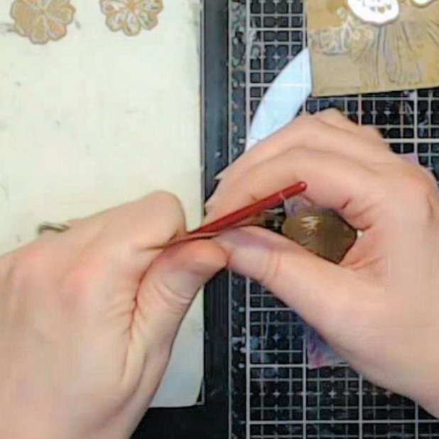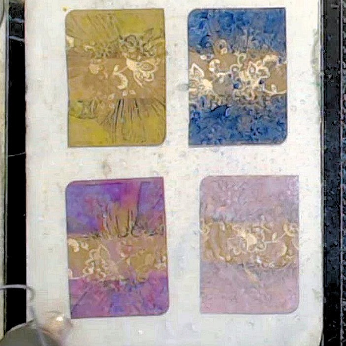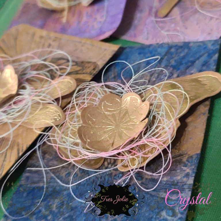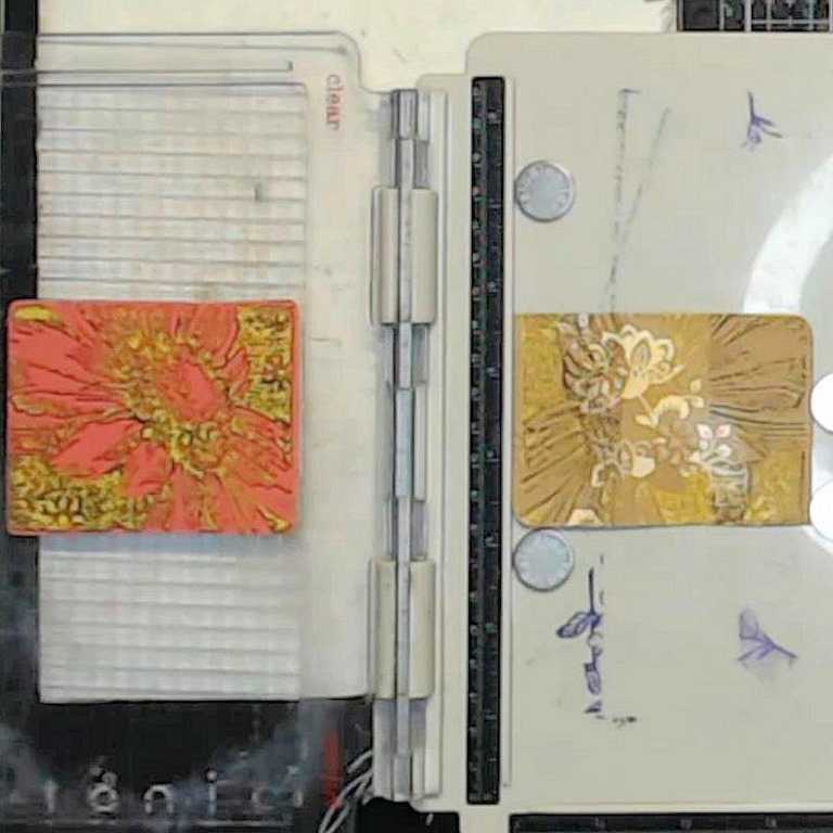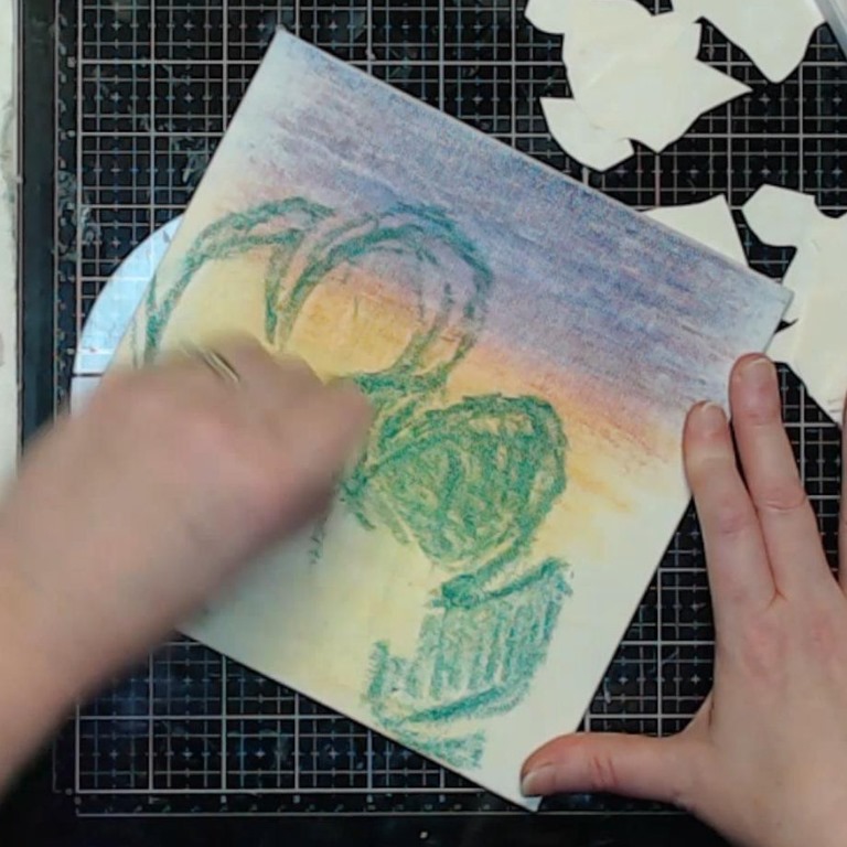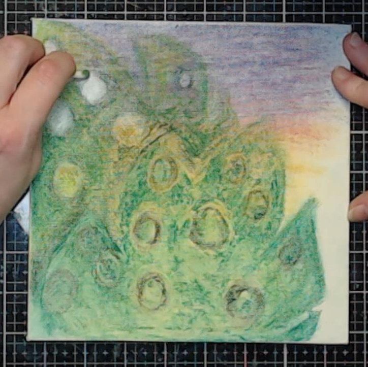Once my leaves were finished, I added another spray of Workable Fixatif, not because I planned on adding more oil pastels, but because I wasn’t entirely sure how well the “Transfer Me” flowers would stick to the oils. I am happy to report that I had no problems getting the transfers in place!