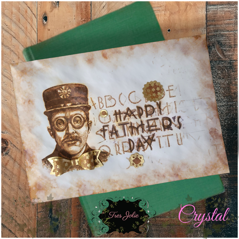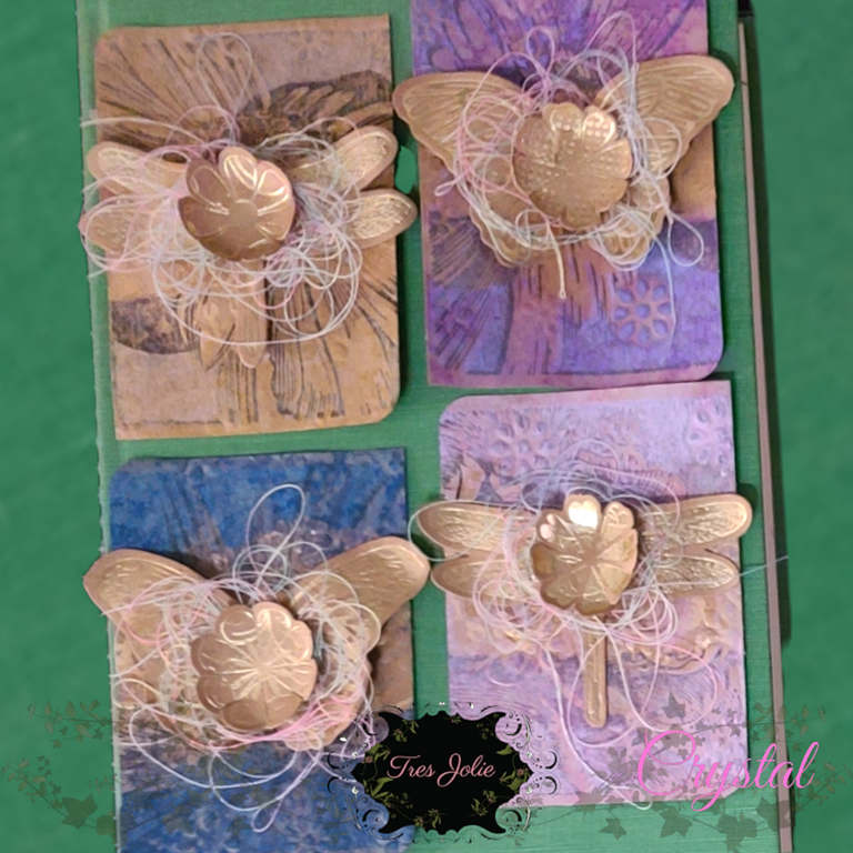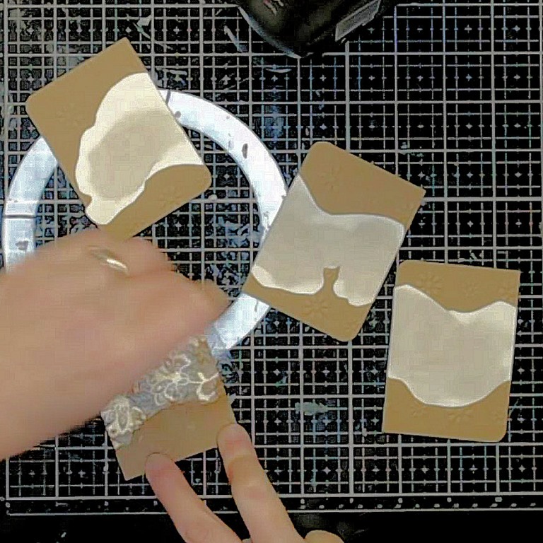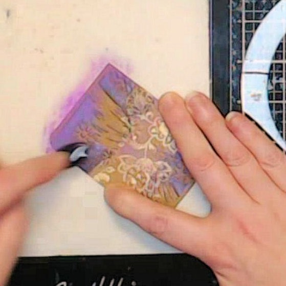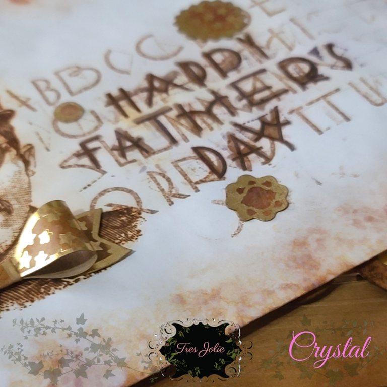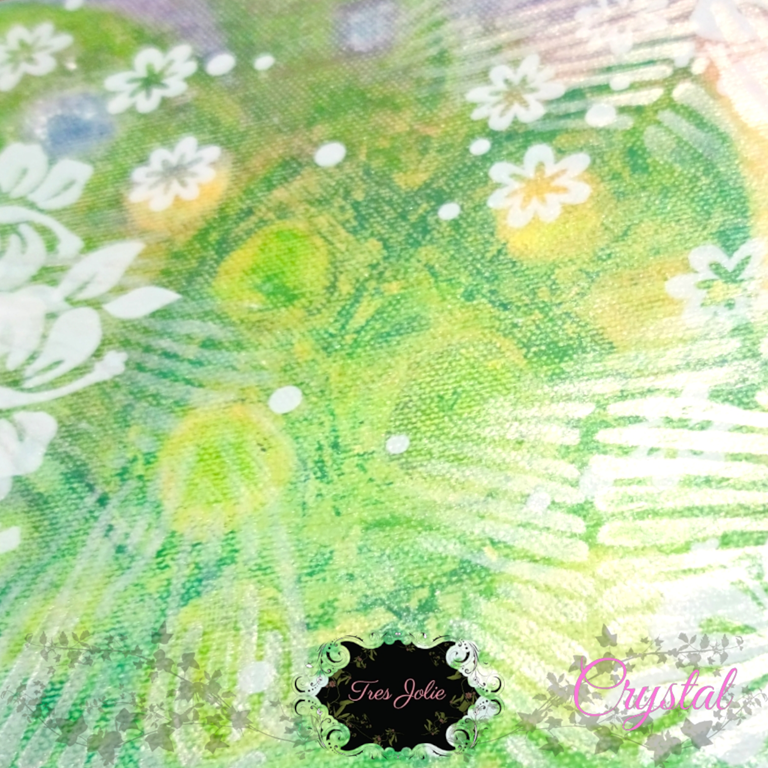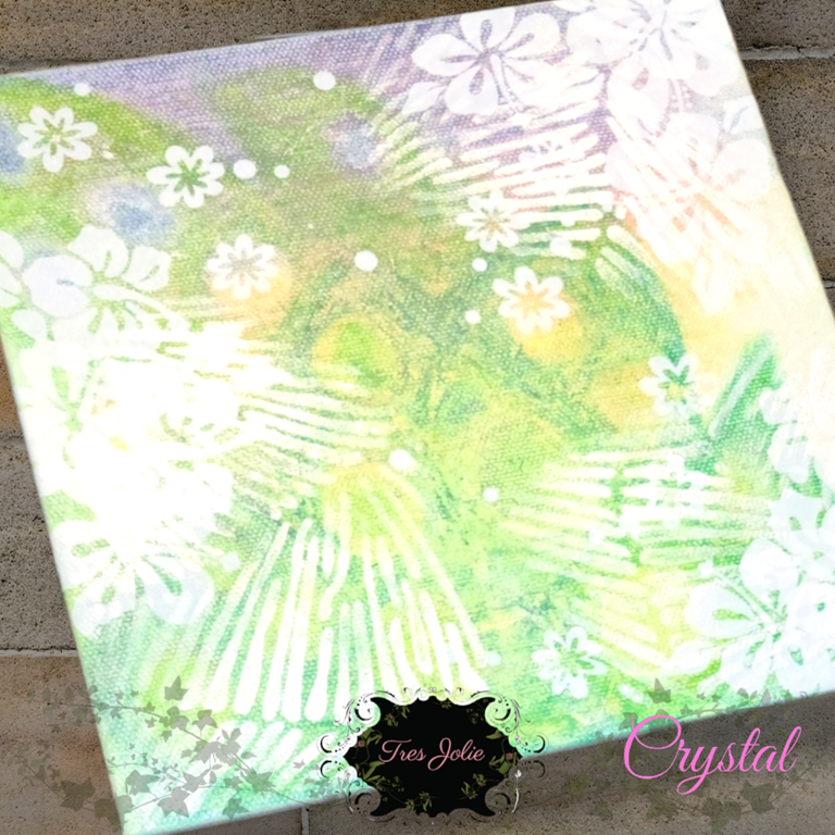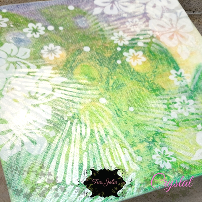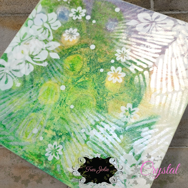 With the transfers on, the only thing left for me to do to finish my canvas was to add some of the Lindy’s Magical Powder. Using a blending brush, I inked on some clear embossing ink through the stencil, then, without removing the stencil, I gently brushed on some of the Magical Powder. The pattern of the stencil also makes me think of tropical leaves, and the Lindy’s gives them a beautiful shimmer.