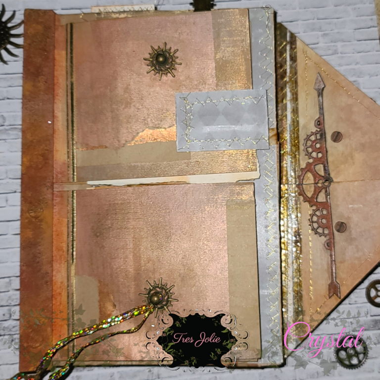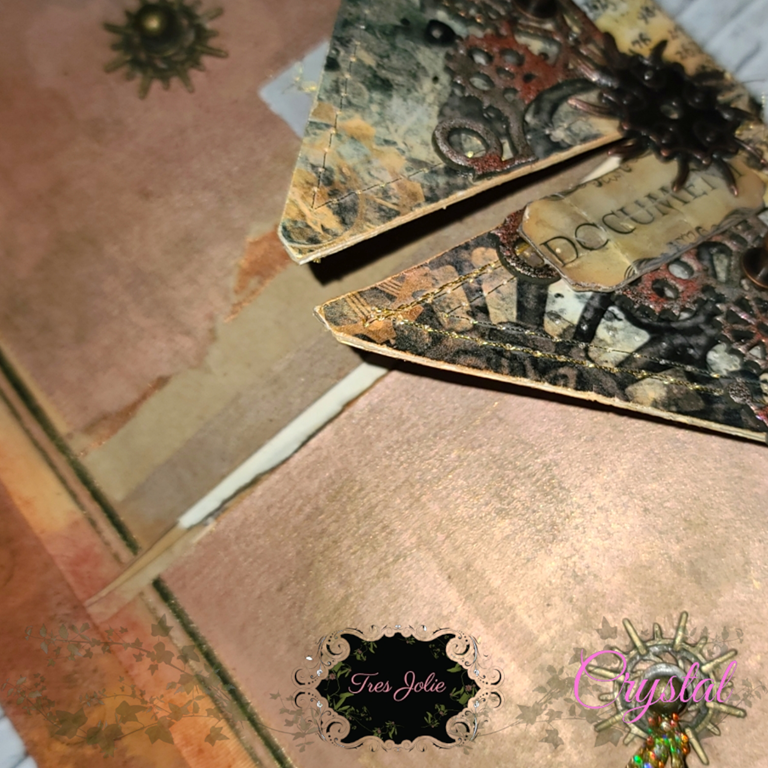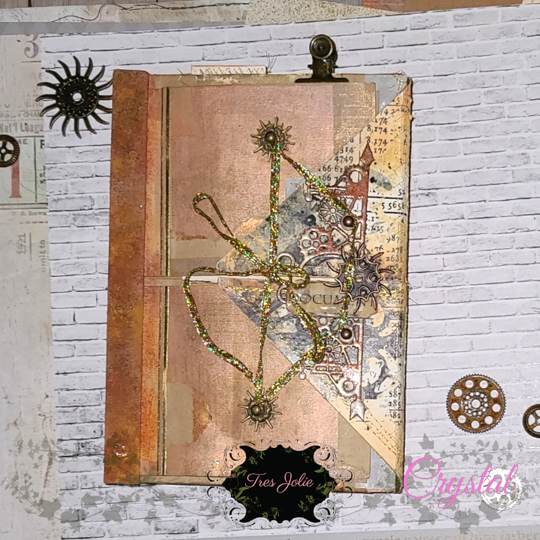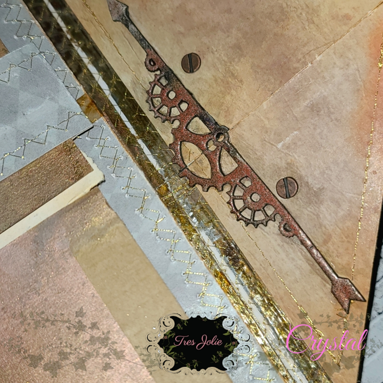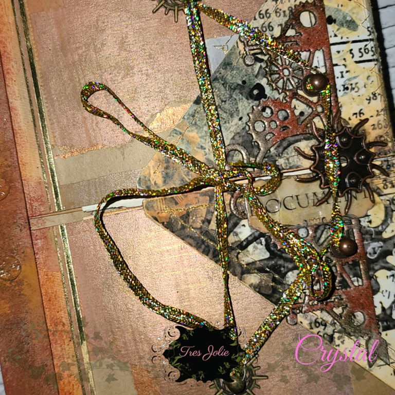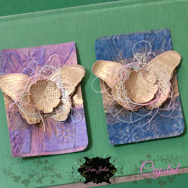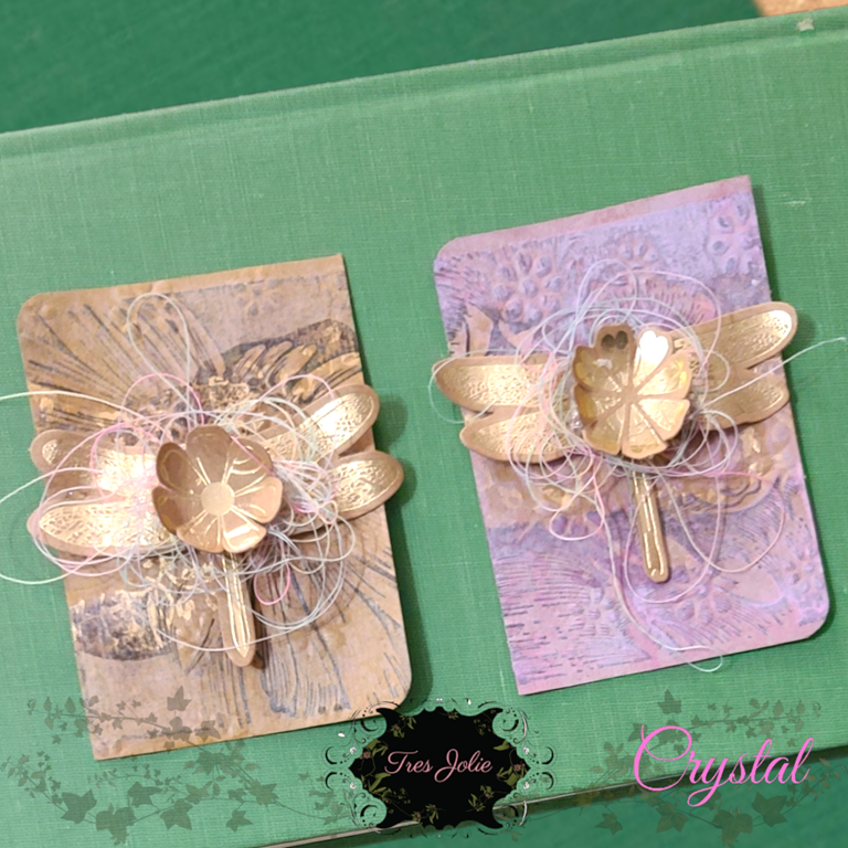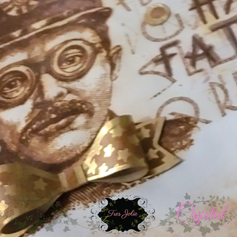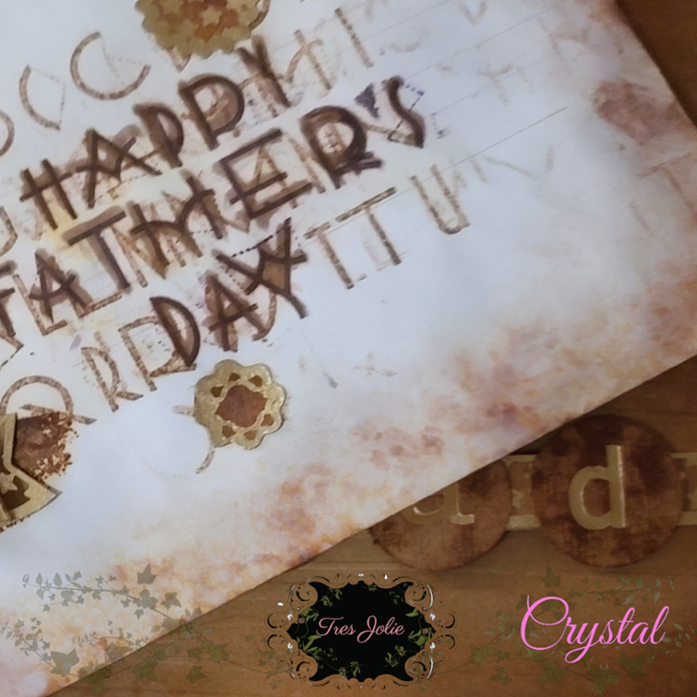 With the transfers on, the only thing left for me to do to finish my canvas was to add some of the Lindy’s Magical Powder. Using a blending brush, I inked on some clear embossing ink through the stencil, then, without removing the stencil, I gently brushed on some of the Magical Powder. The pattern of the stencil also makes me think of tropical leaves, and the Lindy’s gives them a beautiful shimmer.