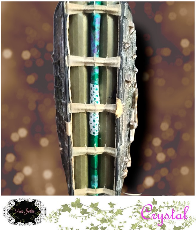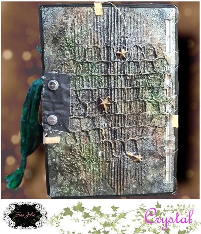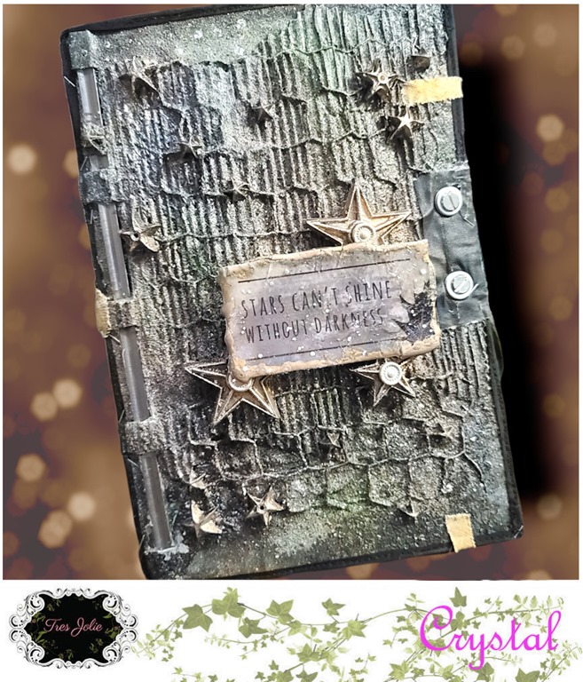 The purple background is made of a variety of dry mediums mixed into some 3D Matte gel spread across the back, and to get the details of the surface I used my brayer again and rolled a couple of layers of “Ginger Magic” on after the black gesso had dried.